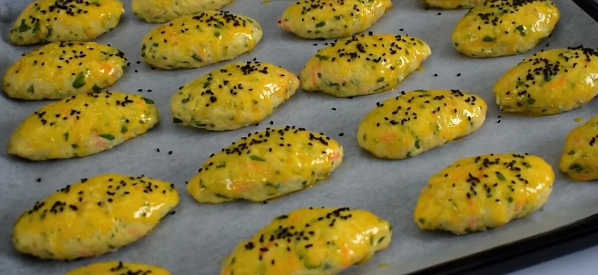 Кладемо на деко з пергаментом і змащуємо збитим жовтком. За бажанням посипаємо кунжутом.