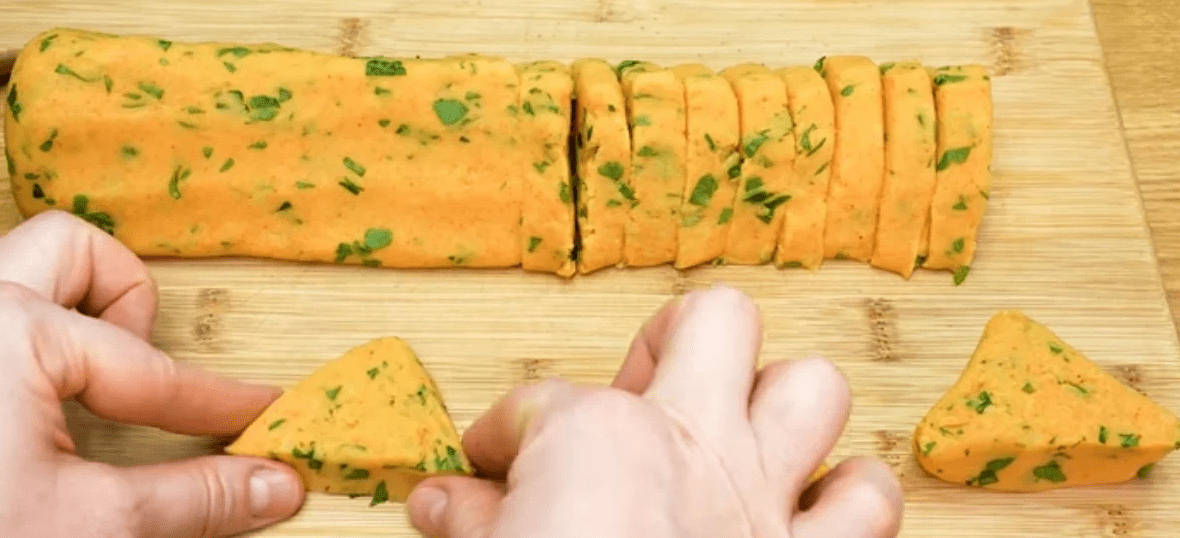 Формуємо ковбасу трикутної форми та нарізаємо на шматочки.