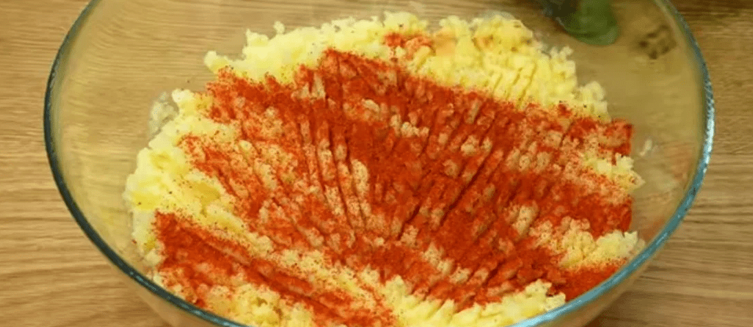 З відвареної картоплі робимо пюре, додаємо паприку, дві щіпки солі, чорний перець та кукурудзяний крохмаль. Все добре перемішуємо. Додаємо нарізану петрушку та перемішуємо.
