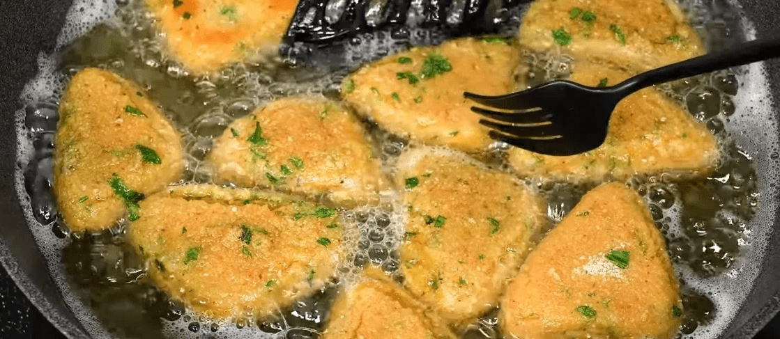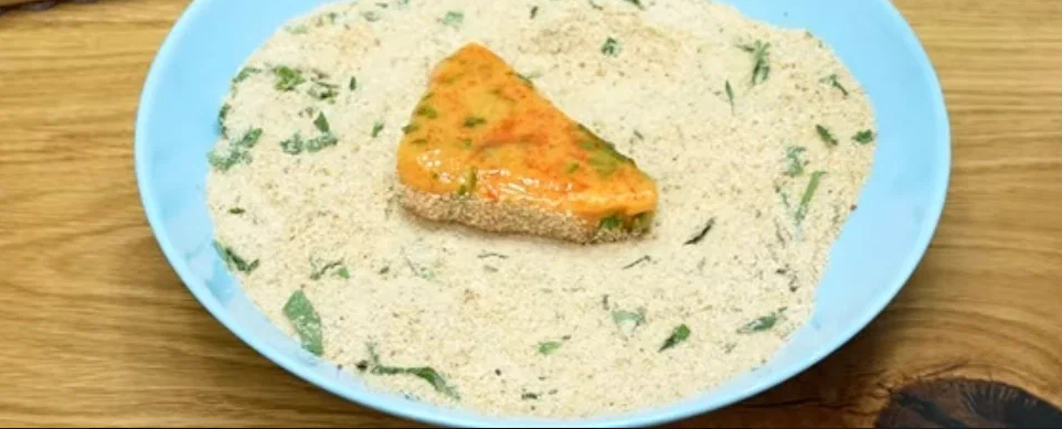 Панірувальні сухарі змішуємо з подрібненою петрушкою. Занурюємо трикутники спочатку в яйця, потім у сухарях.