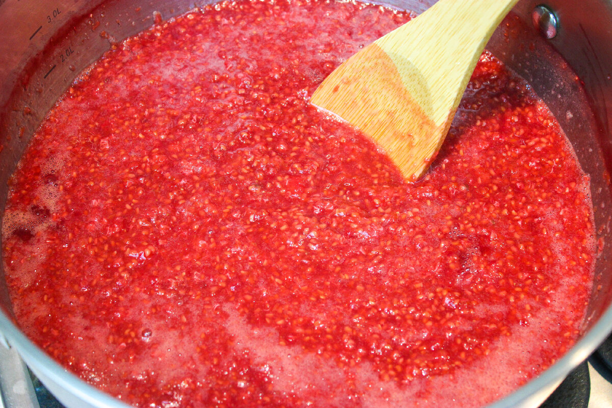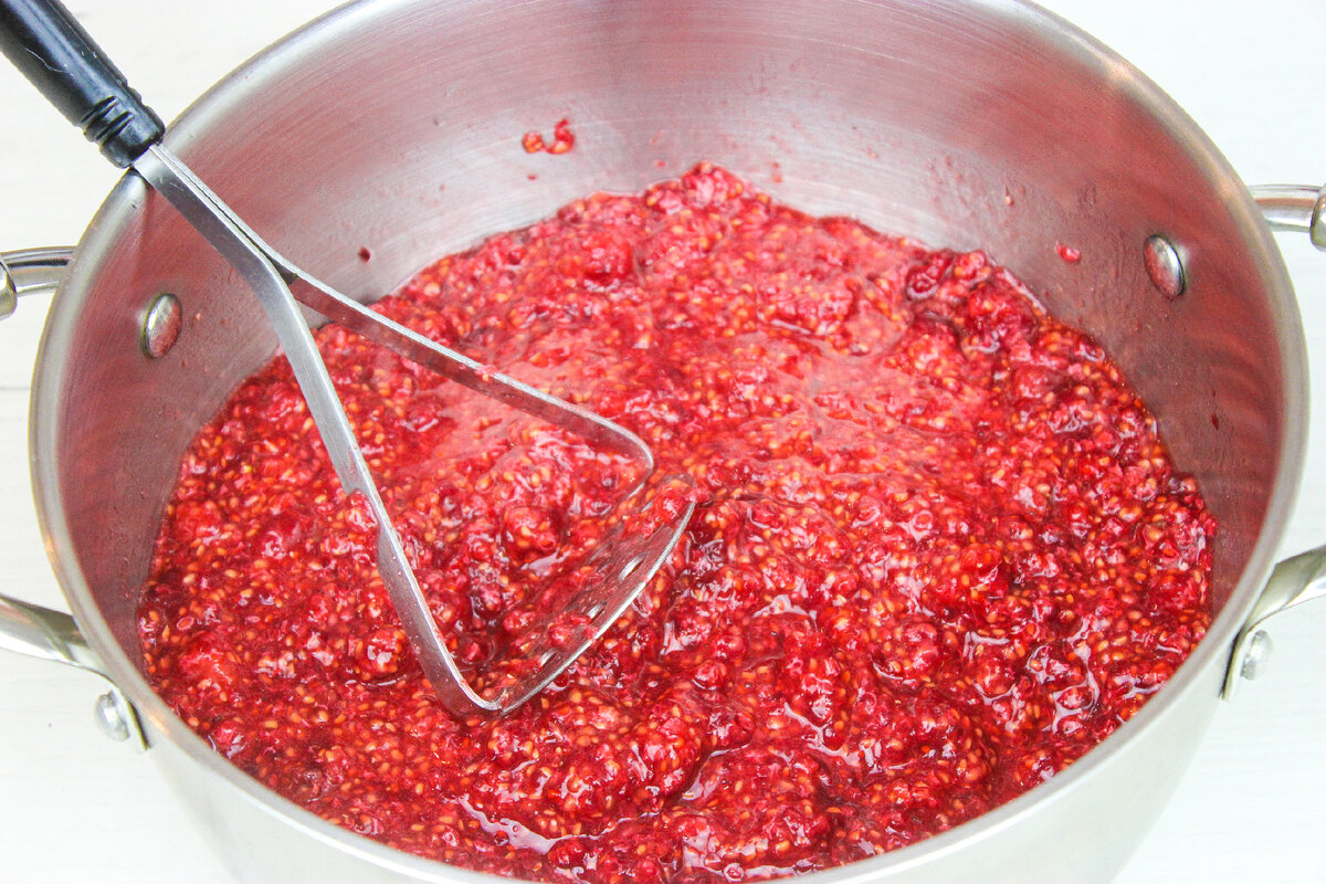 Перекласти малину в каструлю, подрібнити ягоди товкачем або занурювальним блендером до густої однорідної маси.