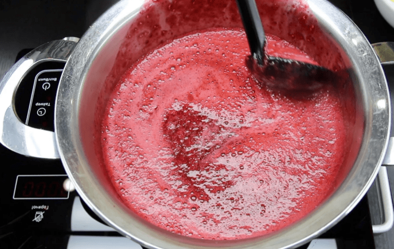 Перемішую і відставляю на якийсь час убік. А доки ставлю малину з цукром на середній вогонь, доводжу до кипіння і варю 5 хвилин. Знімаю пінку, що утворюється на поверхні.
