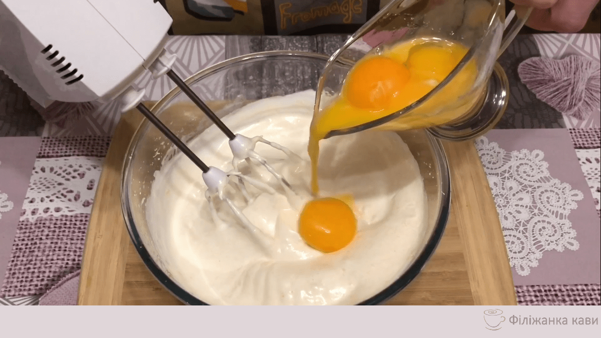 До збитим білків додаємо по одному жовтку і збиваємо міксером після кожного додавання жовтка.