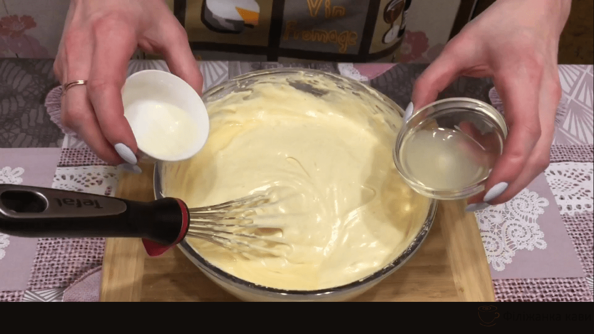 Щоб бісквіт вийшов більш вологим, додаємо 2,5 ст.л. олії. А якщо любите кислинку, додаємо 1,5 ст.л. лимонного соку. Рідини вливаємо по краю миску і акуратно перемішуємо тісто вінчиком.