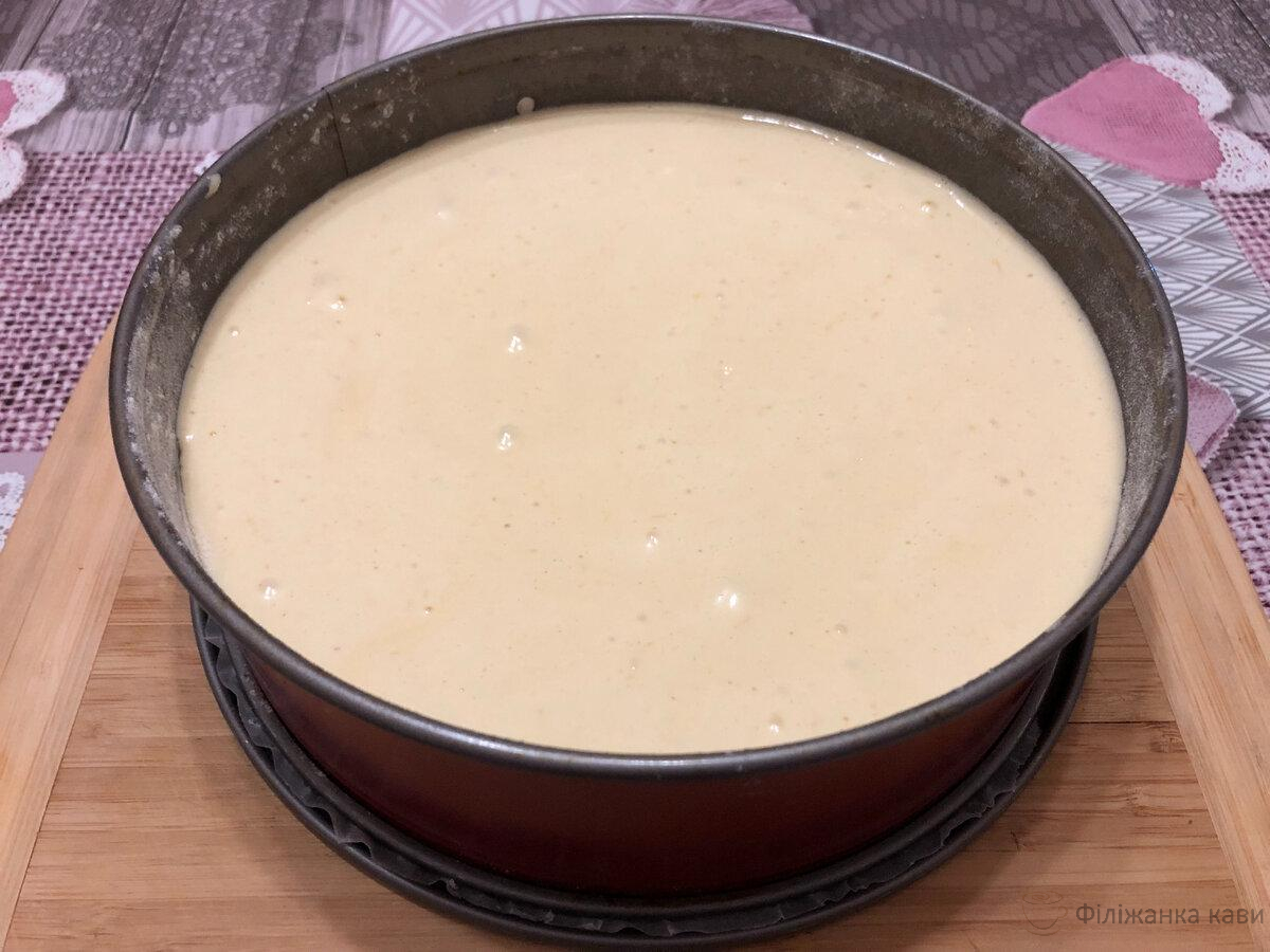 Форму для випікання ( у мене діаметр 22 см ) застеляємо пергаментним папером, а бортики змащуємо олією і присипаємо борошном. Викладаємо тісто в форму, поверхню тіста вирівнюємо лопаткою. Форму з тістом можна кілька разів прокрутити, щоб бісквіт піднімався рівномірно без горбика.