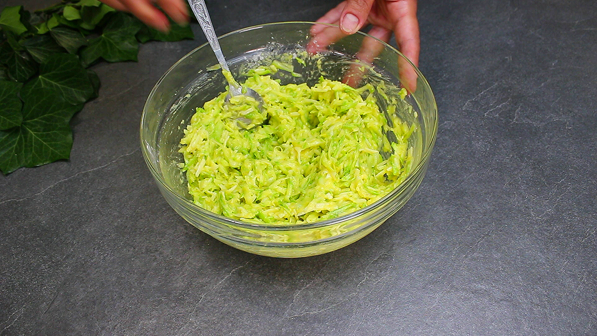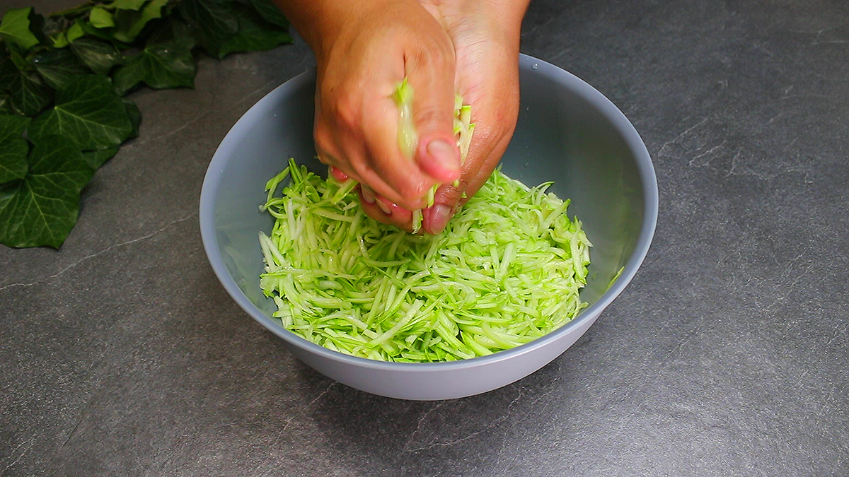 Кабачки натираємо на терці, віджимаємо і перекладаємо в миску.