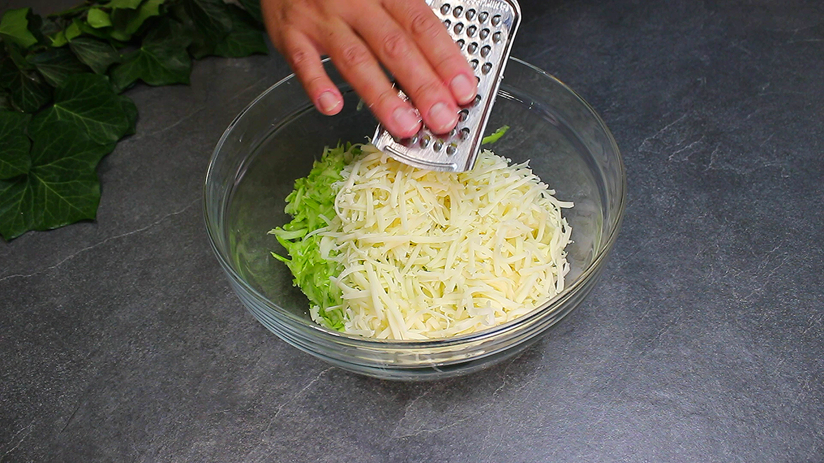 У миску з кабачками натираємо сир.