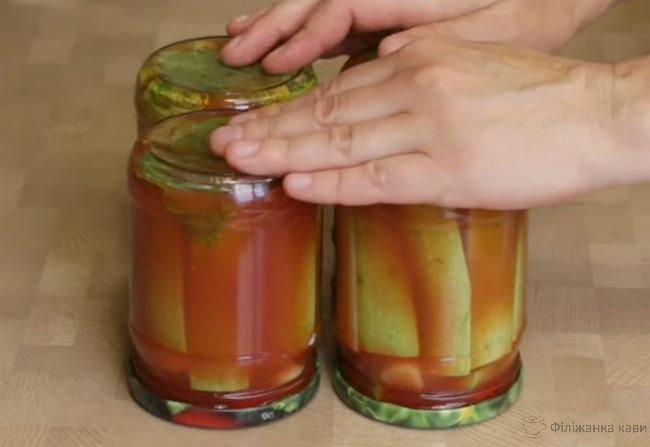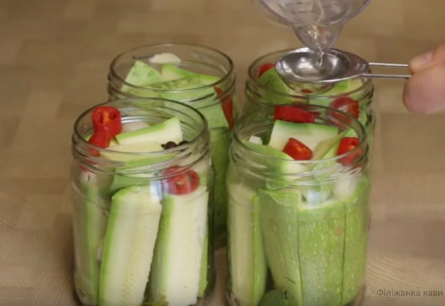 Максимально щільно розклади по банкам кабачки. Залий крутим кип’ятком залиш на 10 хвилин.
