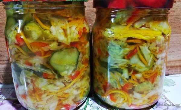 5. Всі овочі скласти в каструлю, залити водою. Додати оцет, олію, всипати спеції, сіль і цукор. Перемішати. Залишити в прохолодному місці на годину.