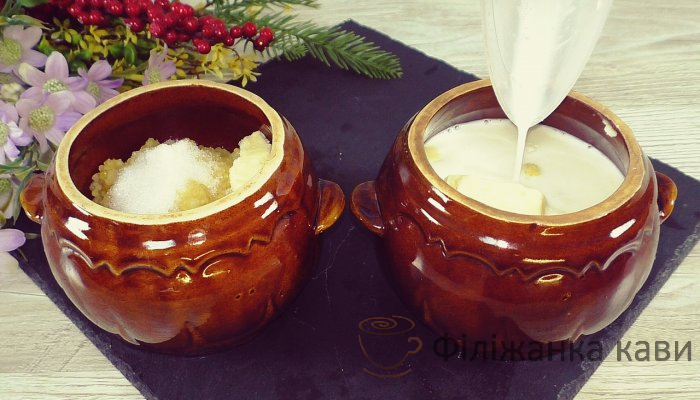 Додаємо цукор, вершкове масло, заливаємо молоком, виходить в один горщик 175 мл. і в інший стільки ж.