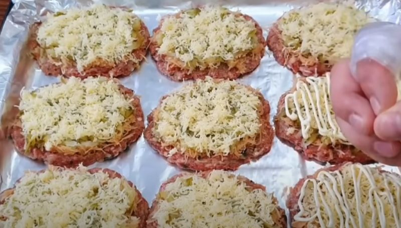 З фаршу формуємо круглі котлети, перетворюємо їх на коржики, як для гамбургерів і викладаємо у форму.