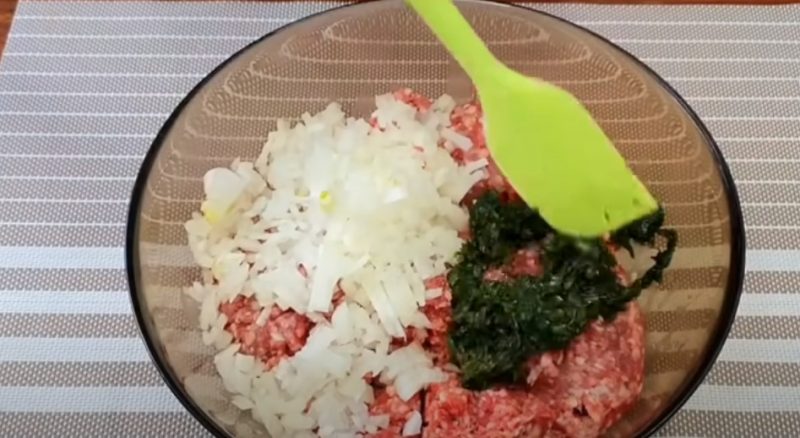 Сухий хліб замочуємо в молоці, після того, як маса набухне, змішуємо з фаршем, дрібно різаною цибулею. Зеленню, усіма переліченими спеціями. Приправи та ароматні трави, а також часник, додавайте на свій смак. Добре вимішуємо масу.