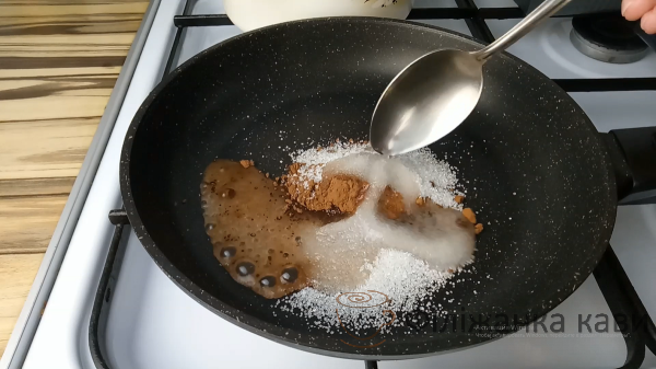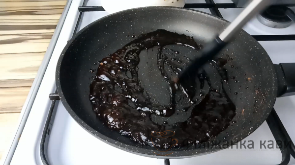 Для помадки в сковороді з’єднуємо 1 ст.л какао, 2 ст.л цукру, 2 ст.л води і 0,5 ст.л рафінованої олії. Перемішуємо до з’єднання продуктів і розчинення грудочок. Помадку проварюємо 1-2 хвилини.