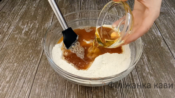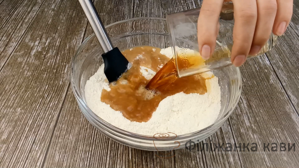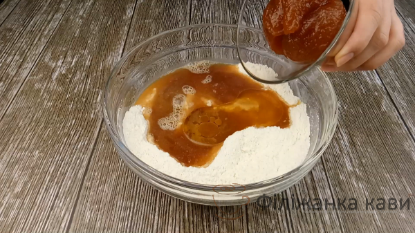 Виливаємо охололу чайну заварку, 4 ст.л рафінованої олії ( 40 грам ), 4 ст.л будь-якого варення ( без кісточок ) і дрібку солі. Перемішуємо, щоб маса стала однорідною, без грудочок.