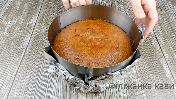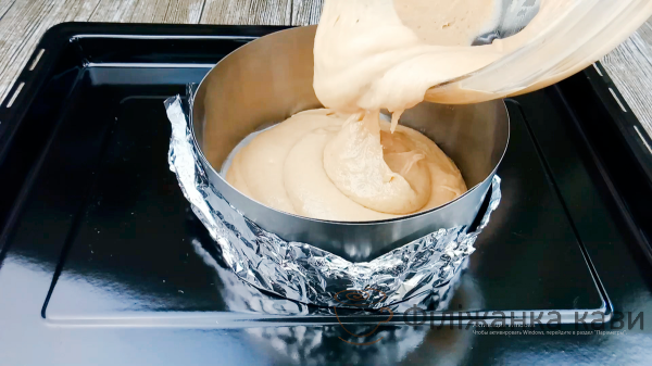 Дно роз’ємної форми або кільця застилаємо антипригарним пергаментом, боки змащуємо рафінованою олією. Якщо візьмете роз’ємне кільце, тоді зовні оберніть його в 2 шари фольги. Виливаємо тісто і розрівнюємо.