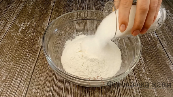 Окремо в миску просіюємо 250 грам борошна, додаємо 150-200 грам ( якщо варення кисле ) цукру. Перемішуємо.