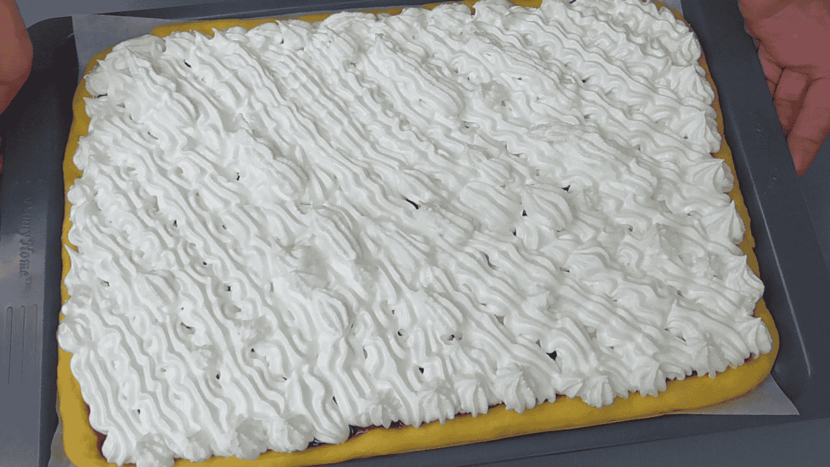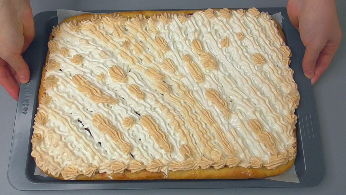 ✅ Отримане безе за допомогою кондитерського мішка відсаджуємо поверх начинки з повидла. Якщо у вас немає кондитерського мішка або ви не хочете з ним возитися, можна викласти безе просто ложкою, зробивши з її допомогою невеликі, але ефектні піки.