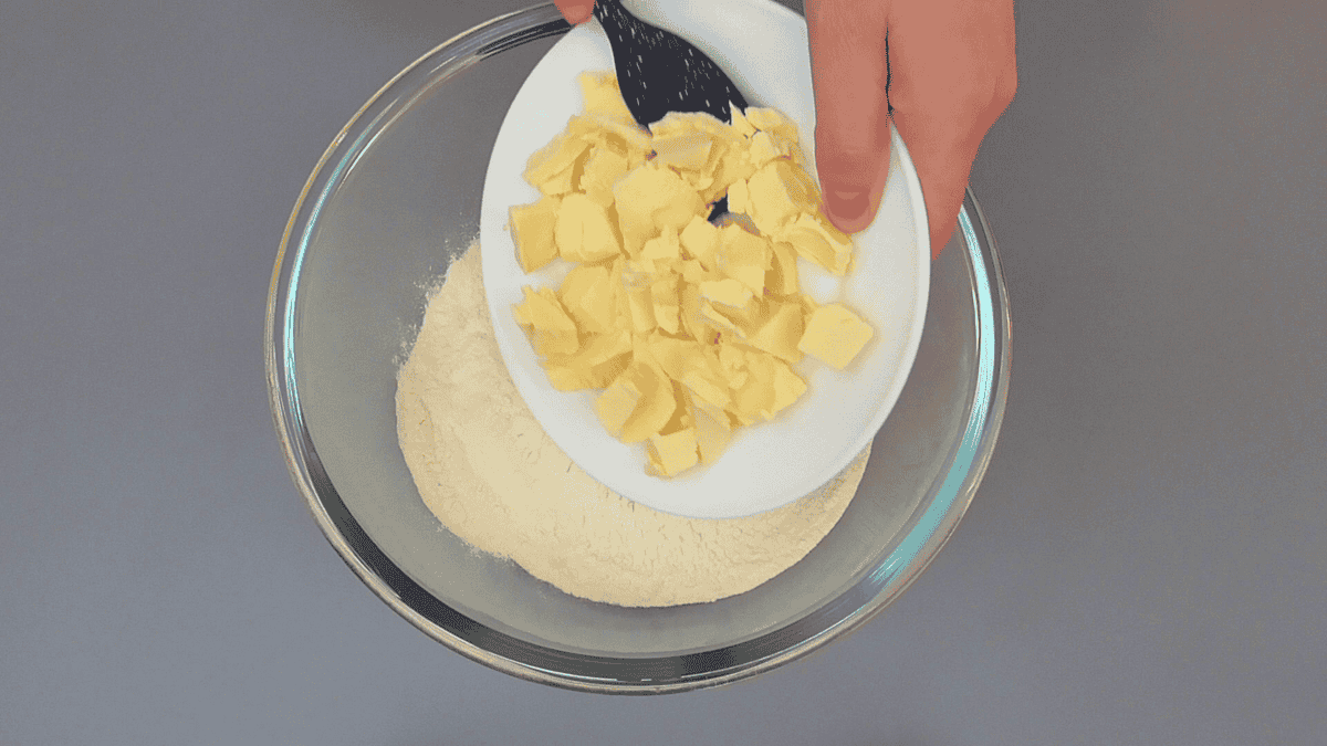 ✅ Масло ріжемо на дрібні шматочки, злегка підморожуємо, потім додаємо його в борошно і робимо крихту.
