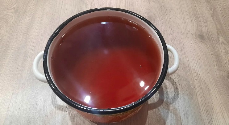 - Далі зливаємо воду із банки в каструлю. Вона вже досить забарвлена. Насипаємо цукровий пісок та додаємо лимонну кислоту. Доводимо до кипіння і варимо приблизно одну-дві хвилини.