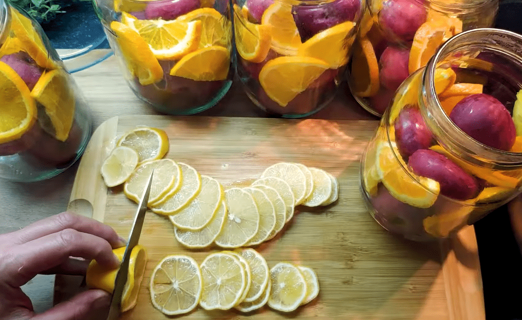 6. У лимона відрізаємо хвостики та нарізаємо тонкими кружальцями. Кладемо в кожну банку по кілька кружків лимона і пару гілочок м’яти.
