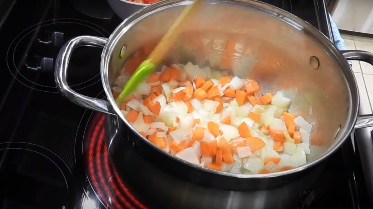 - Налийте олію на дно великої каструлі, всипте цибулю і обсмажте протягом 2 хвилин. Додайте моркву і готуйте ще 2 хвилини.