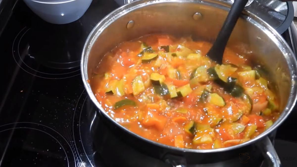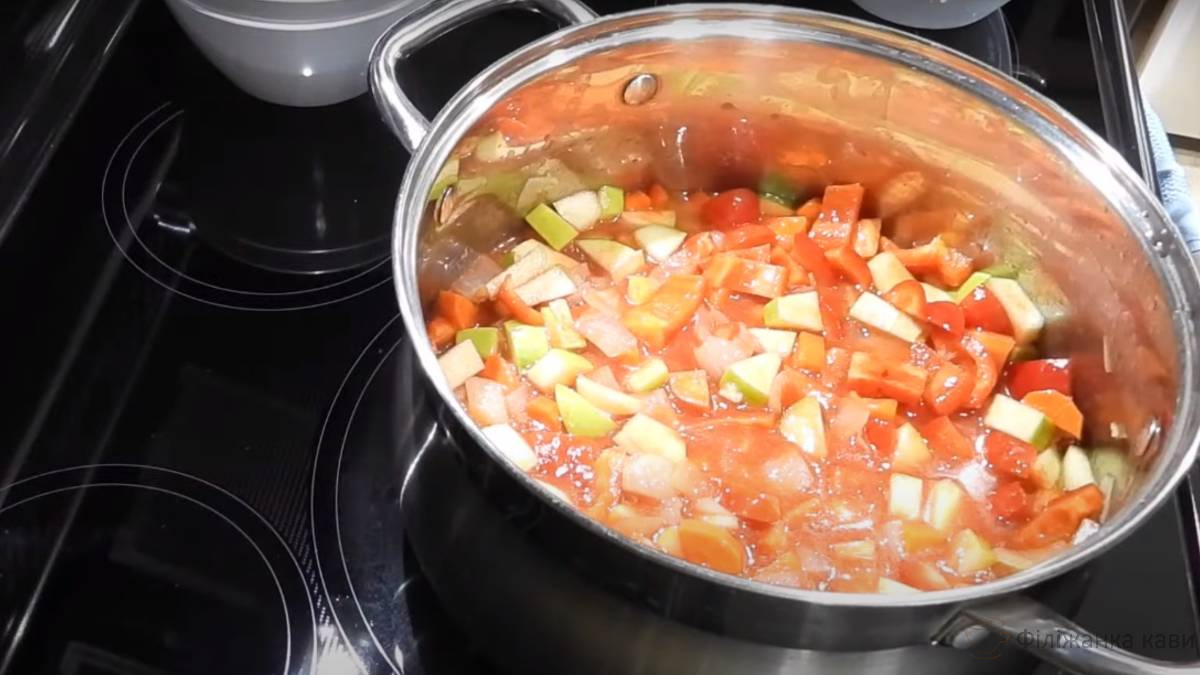 - Додайте перець і яблука, перемішайте і влийте томатний сік. Тушкуйте під кришкою 15 хвилин.