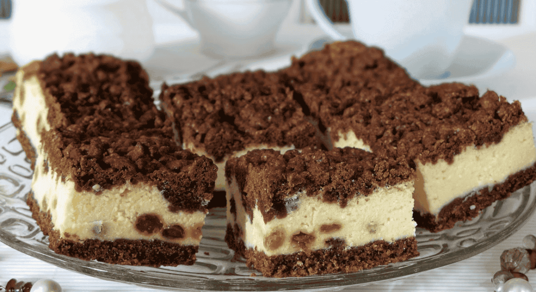- Сирна маса: родзинки, залити окропом. Через кілька хвилин зцідити і посипати борошном. Відкласти. М’яке вершкове масло розтерти з цукром до однорідної консистенції. Відокремити жовтки від білків. З’єднайте білки з тими, що залишилися від пісочного тіста. Поступово додайте жовтки до збитого масла і цукру, постійно збиваючи. Потім частинами додайте сир, не припиняючи збивати. В кінці додайте пудинг і ретельно перемішайте.