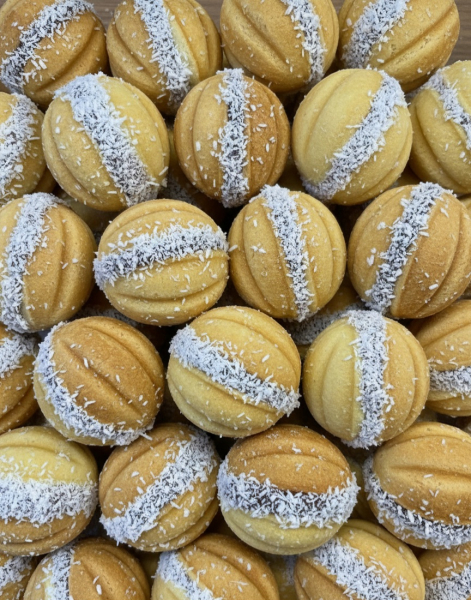 Усе змішати, замісити нетуге тісто, розкочувати завтовшки 0,5 см, випекти печиво. Гарячим обкачати в цукровій пудрі. А можна сформоване печиво змастити білком і посипати цукром.