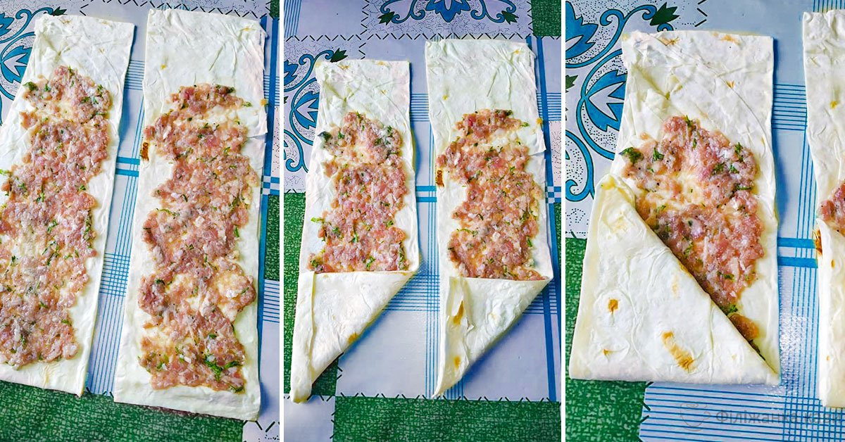- Тепер займемося лавашем. Наріж його довгими широкими смужками, а потім загортай так, як на фото. Головне – не класти занадто багато начинки, тому що буде важко все вмістити.