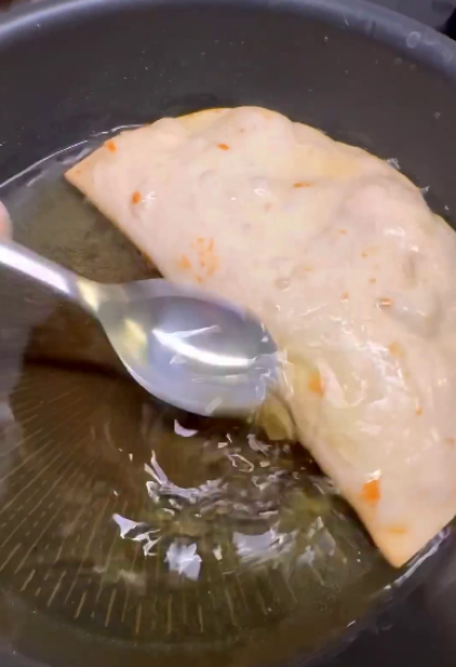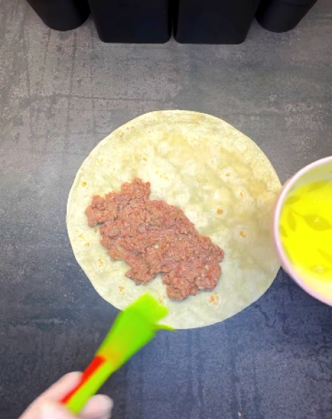 🔻На лаваш викладаємо начинку, краї промазуємо білком і формуємо чебуреки, добре притискаючи краї.