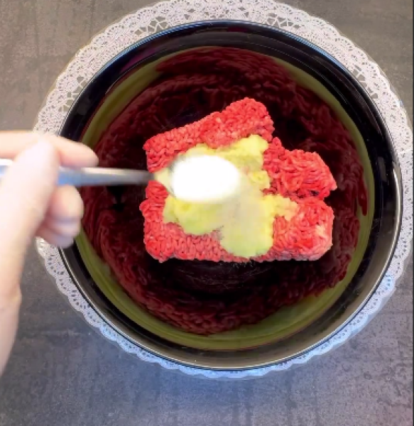 🔻 Подрібнюємо цибулю, змішуємо з фаршем, додаємо сіль, перець, олію та воду.