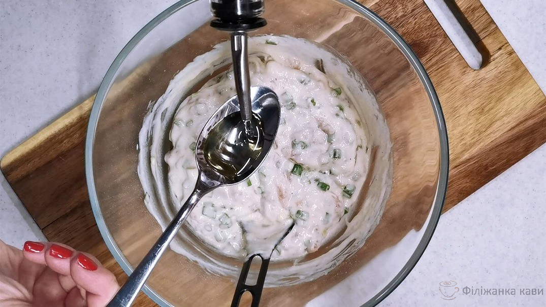 Потім додаю трохи олії і перемішую в останній раз. Після цього суміш перемішувати більше не рекомендується.