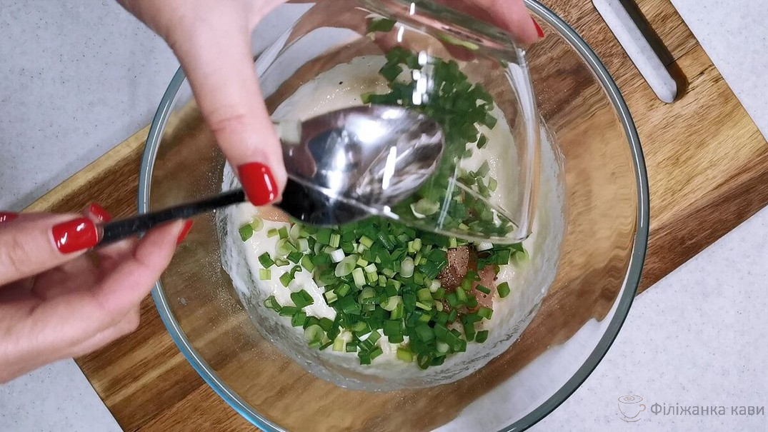 Спочатку готую начинку, щоб вона відразу була під рукою в потрібний момент. Дрібно рублю ножем куряче філе. Потрібно, щоб були дрібні шматочки. Фарш тут підходить не дуже добре. Ще ріжу зелену цибулю. Приступаю до тіста. У миску вбиваю яйце кімнатної температури, додаю сіль, трохи цукру і вливаю кефір, нагрітий до температури приблизно 40 градусів. При нагріванні він може почати зовсім трохи згортатися, але це нормальний процес. Перемішую все це вінчиком до однорідності.