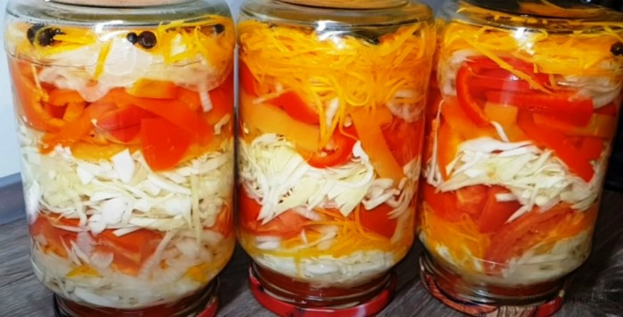 - Вкладаємо в чисті банки лавровий лист, перець духмяний і горошком, моркву, цибулю, солодкий перець, капусту і помідори. Банки заповнюйте щільно, щоб банки після стерилізації були повними. Овочі чергуємо пару раз.