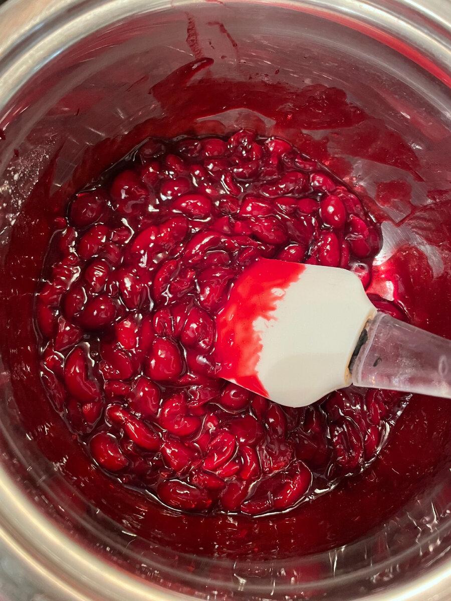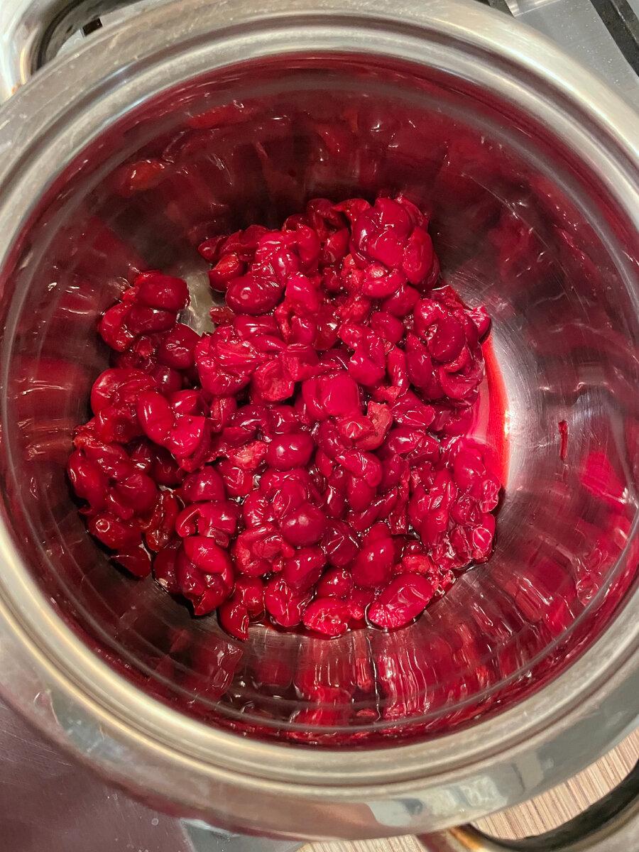 Крок 2. Вишню викладаємо в маленьку каструльку або ковшик. Ставимо на невеликий вогонь, додаємо цукор і варимо близько 5 хвилин, постійно помішуючи.