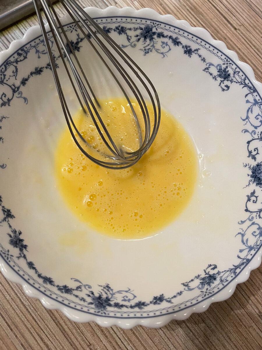 Крок 4. Поки наша начинка остигає приготуємо суміш для змащування. В окрему миску вбиваємо яйце, додаємо молоко або сметану, ванільний цукор і збиваємо вінчиком до однорідної маси.