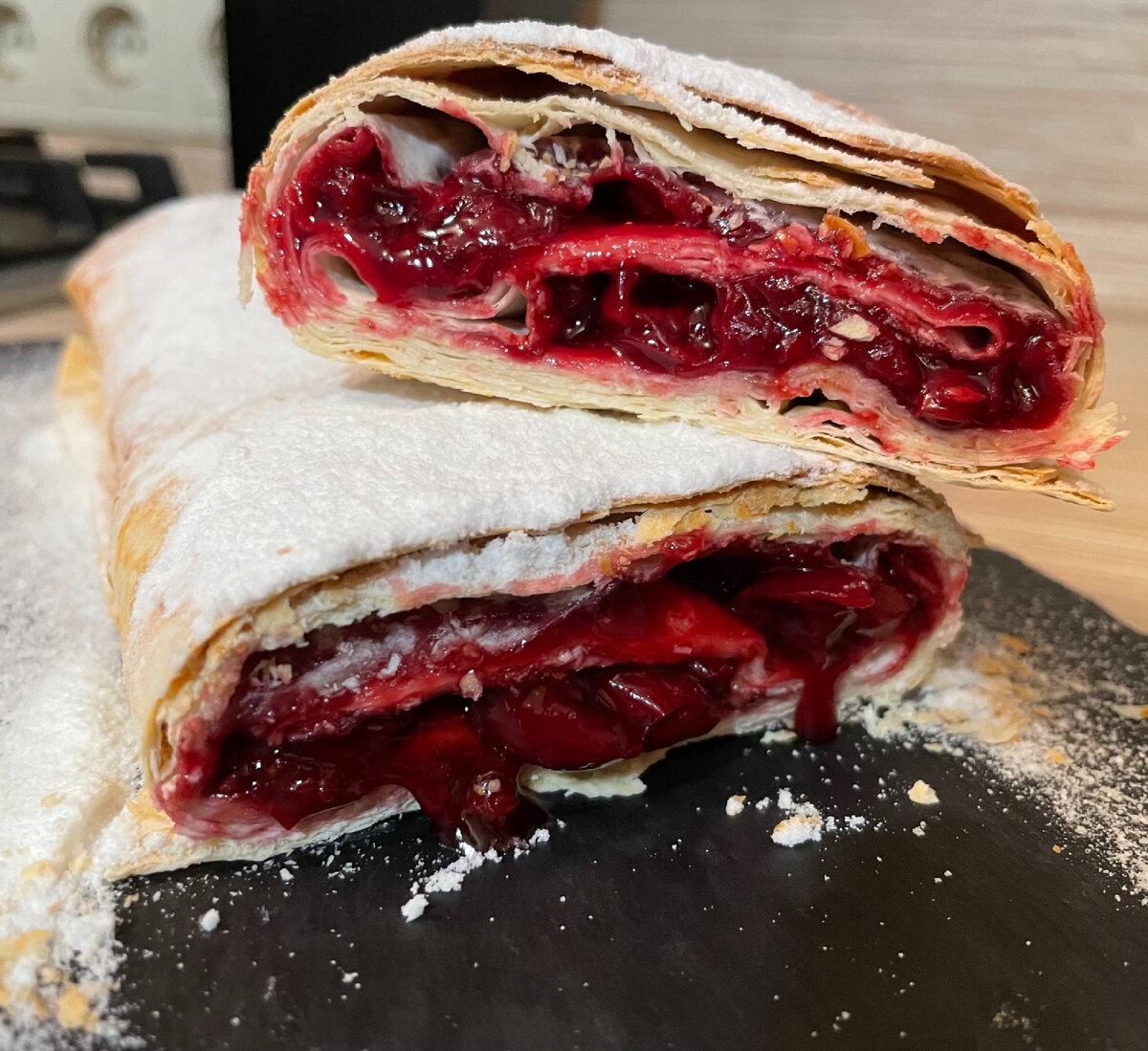 Лінивий штрудель з лаваша з вишнею! Як же це смачно і просто! Лаваш спрощує весь процес приготування, але при цьому виходить така ж смачна і хрустка скоринка, як і в цьому оригінальному рецепті. А вишнева начинка має кисло-солодкий смак і нереальний аромат!
