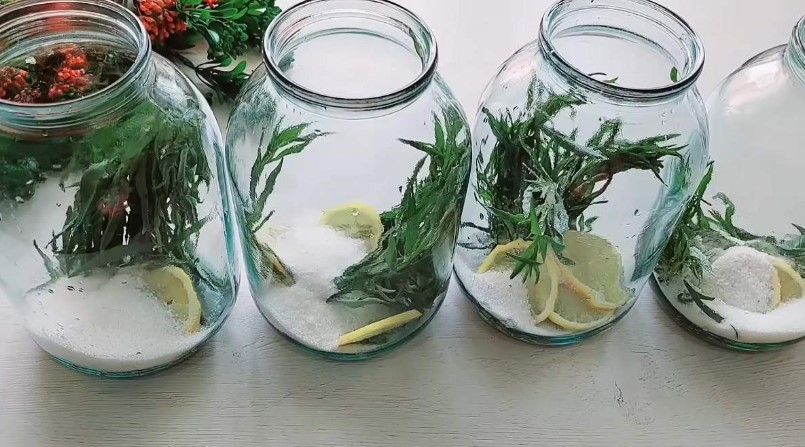 Розкладіть по банкам тархун та лимон. У кожну банку всипте по 80 г цукру та залийте інгредієнти окропом.