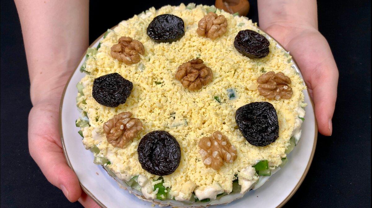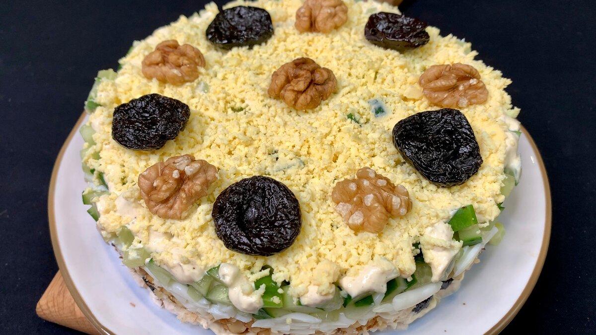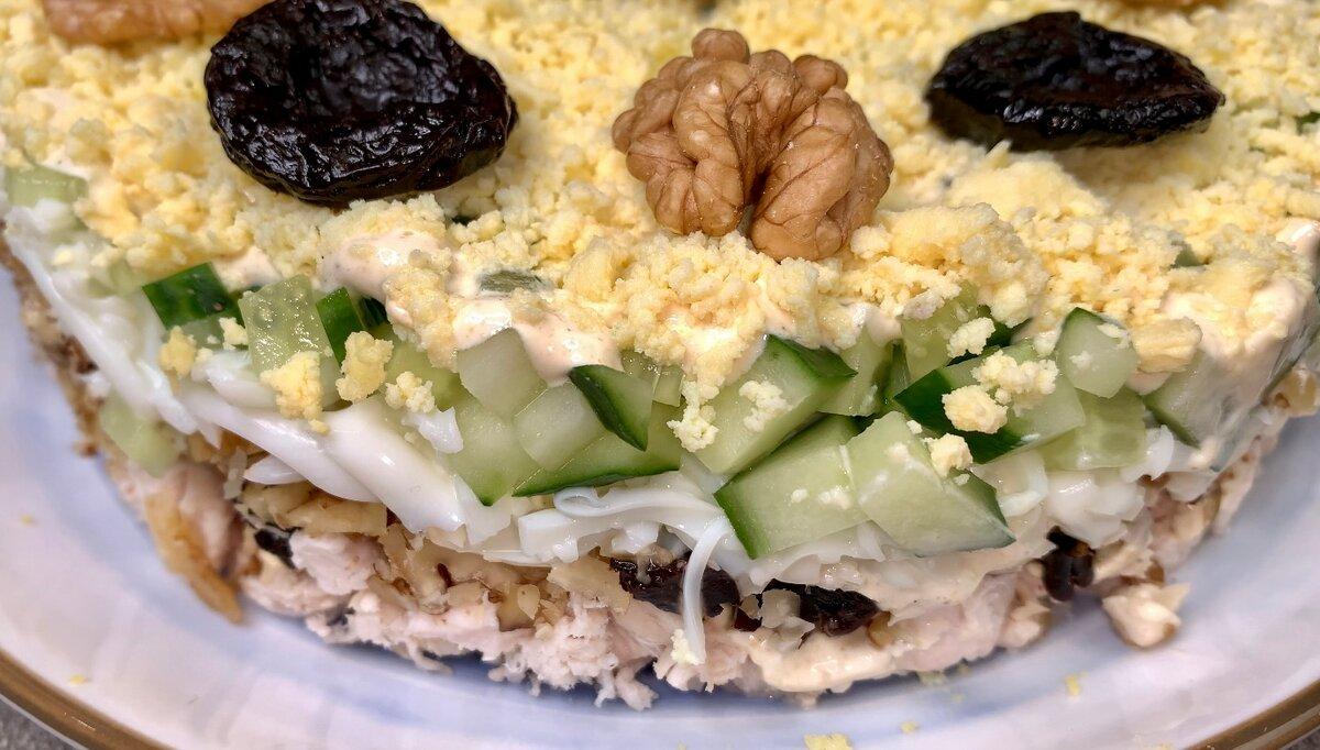 Залишилося прикрасити верх чорносливом з волоськими горішками і можна ставити салат на стіл! Подивіться, як красиво він виглядає!