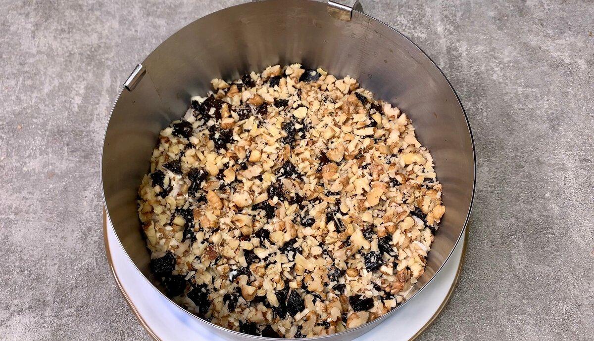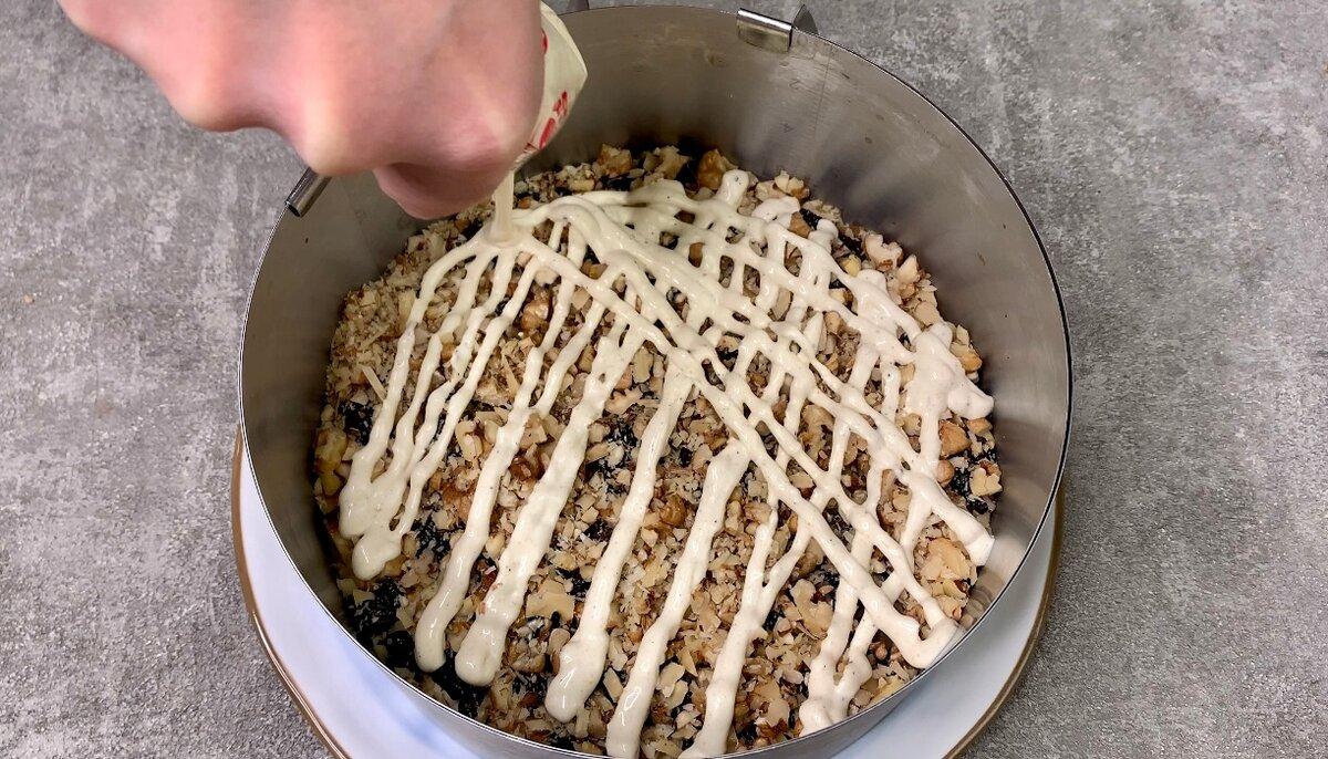 3. Наступним шаром розділимо подрібнений чорнослив, дроблені волоські горішки і повторюємо соусну сіточку.