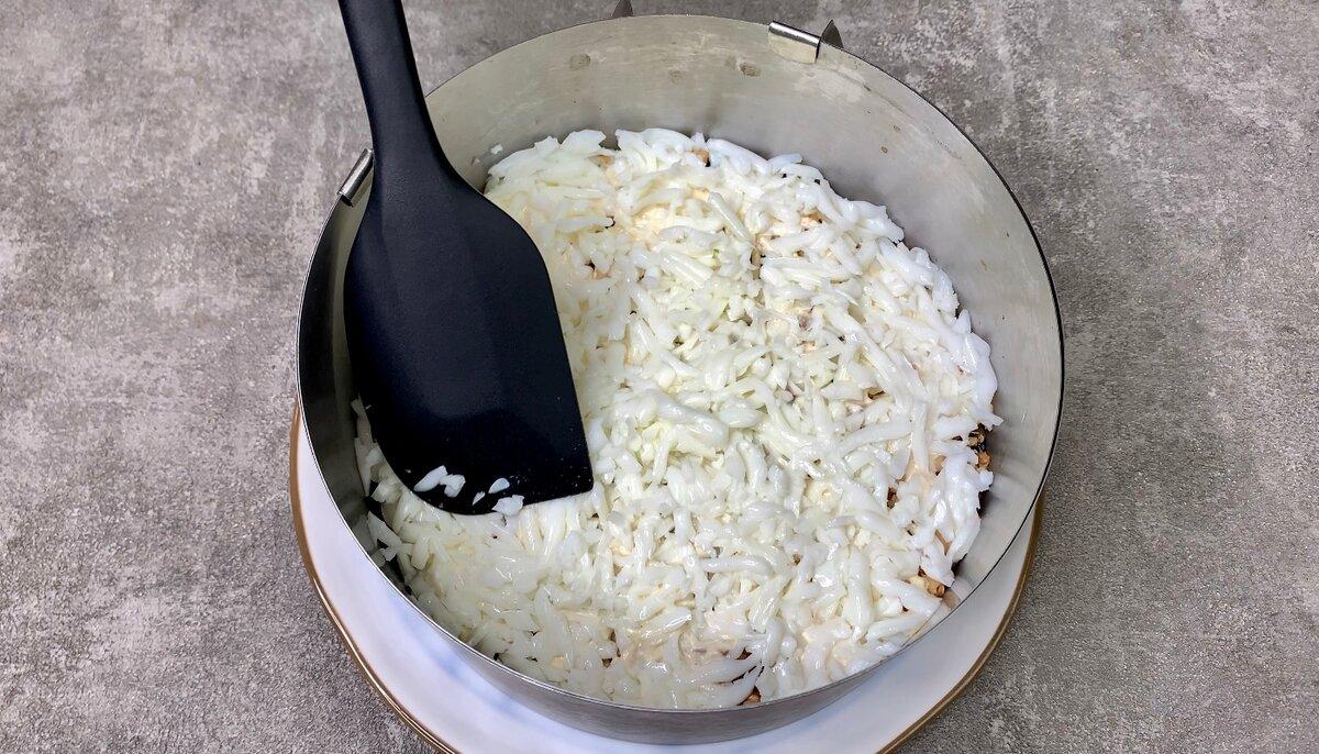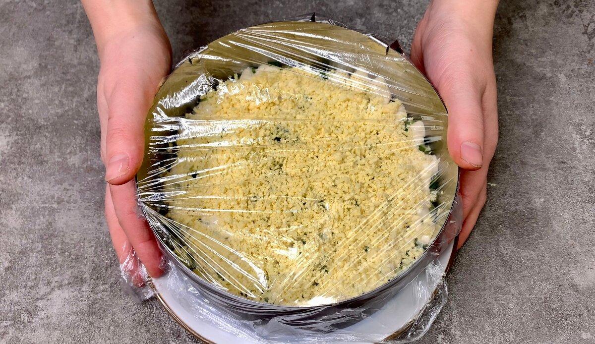 5. Зверху наносимо ще один шар соусу і акуратно присипаємо тертими яєчними жовтками. Готовий салат накриваємо харчовою плівкою і відправляємо настоятися в холодильник на 30 хвилин.