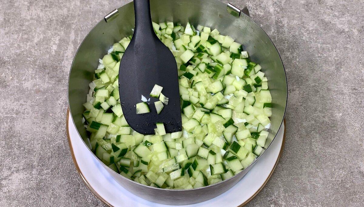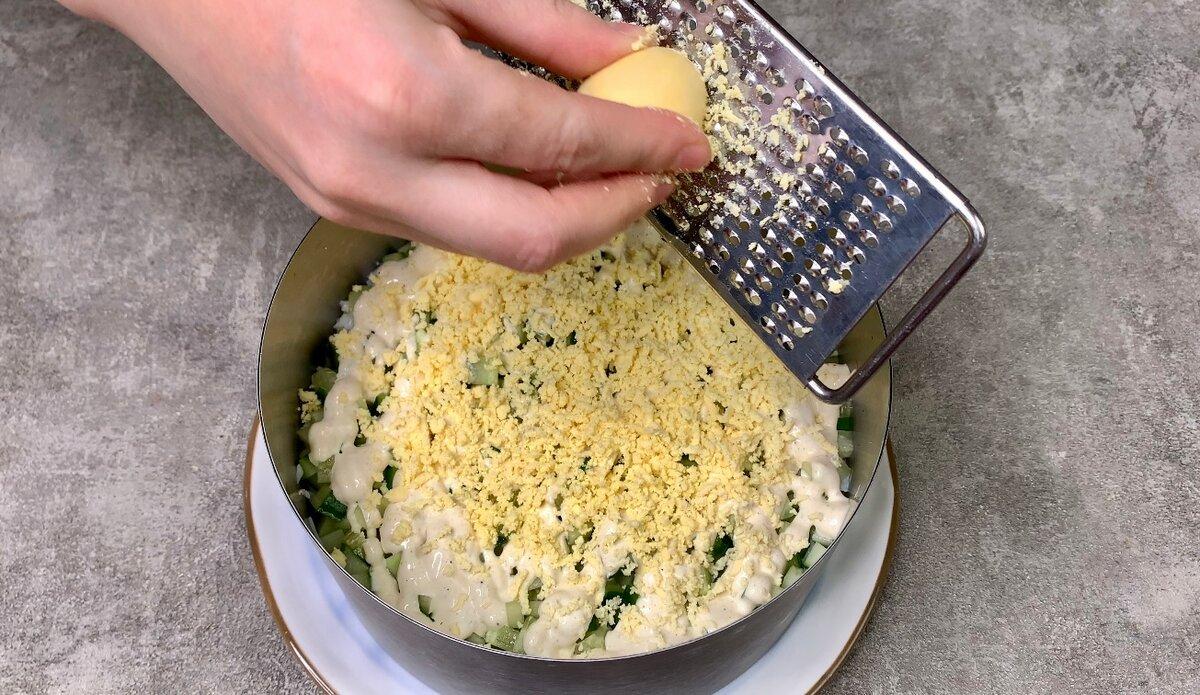 4. Далі в хід йдуть терті яєчні білки і свіжий огірок, нарізаний кубиком.