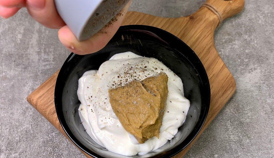 1. Для соусу змішуємо сметану, гірчицю, пару щіпок солі і чорний мелений перець.
