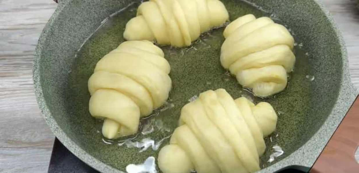 У сковороду наливаємо олію і кладемо круасани обсмажуватись.