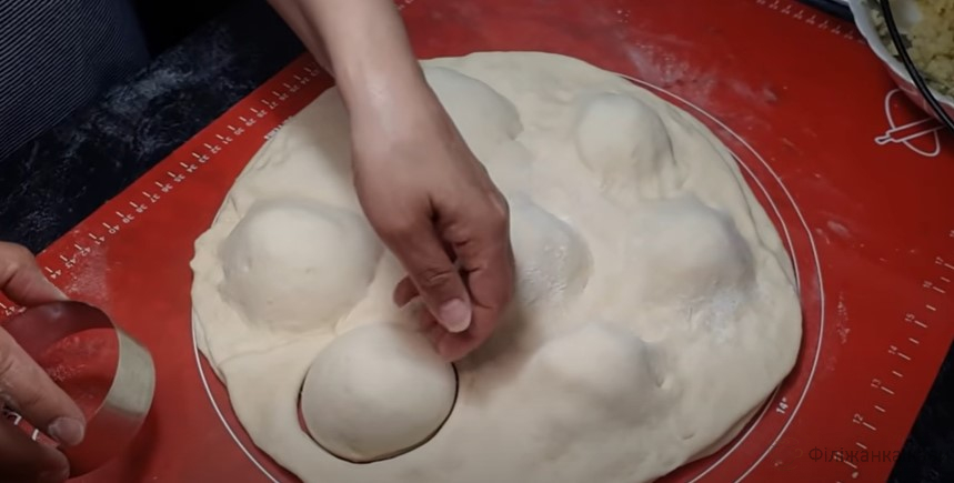 На один пласт викладаємо начинку з рівними проміжками. Накриваємо другим пластом і вирізаємо склянкою або чашкою пиріжки так, щоб усередині кожного опинилася начинка. Або робіть пиріжки традиційним способом руками, змащеними олією.
