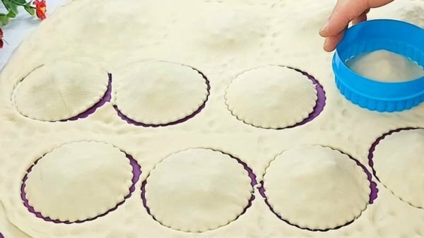 Накрийте начинку другим пластом, пальцями приміть простір між майбутніми пиріжками. Візьміть круглу форму відповідного діаметру ( або стакан ) і виріжте заготовки.