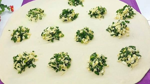 Припорошіть стіл борошном і викладіть тісто. Розділіть його навпіл і обімніть кожну частину, потім розкачайте кульки в тонкі пласти. Викладіть на один лист тіста начинку так, як показано на фото.