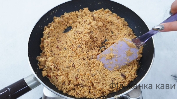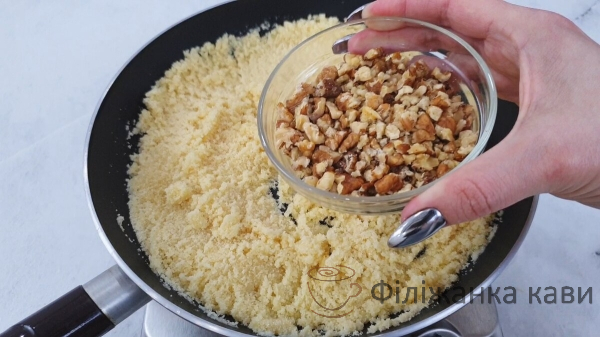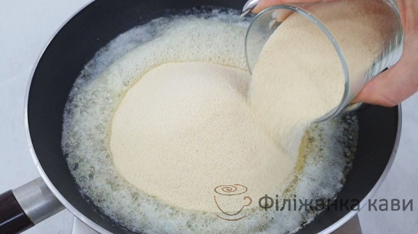 Підсмажуємо манку з горіхами на середньому вогні, постійно помішуючи. Смажимо крупу, поки вона не придбає коричневий відтінок.