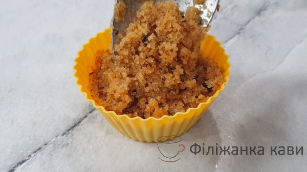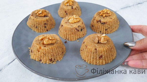 Даємо охолонути і перевертаємо «кекси» на тарілку. Прикрашаємо десерт половинкою волоського горіха.