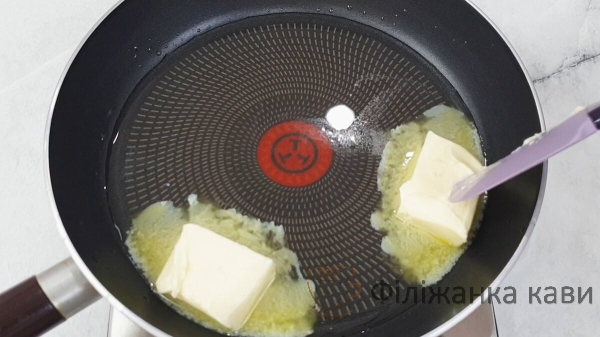 У сковороду виливаємо 70 грамів олії. І додаємо 80 грамів вершкового масла. Розігріваємо сковороду і розтоплюємо вершкове масло.